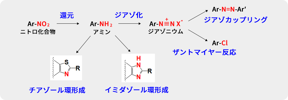 染料製造で培われてきたアゾ化合物、チアゾールやイミダゾールといったヘテロ環化合物の精密かつ量産可能な有機合成技術により、医薬中間体やレジスト原料、スクリーン印刷用原料、そして二色性色素などを製造しています。二硫化炭素を用いたイミダゾール環形成、塩化チオニルを用いた酸クロライド合成、塩化シアヌルからのトリアジン誘導体合成が特徴です。また産学連携により蛍光標識物質の開発も行っています。
