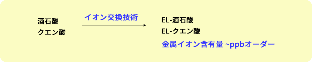 半導体洗浄に使われるEL-有機酸は多価カルボン酸が持つキレート作用を金属除去に用いています。その成分には厳しい基準が設けられており、含まれる金属イオンは極限まで除去しなければなりません。当社では原料である酒石酸やクエン酸を自社で製造できる強みを生かし、高純度なイオン交換水とイオン交換技術により金属イオンをppbレベルまで除去した製品を世に送り出しています。